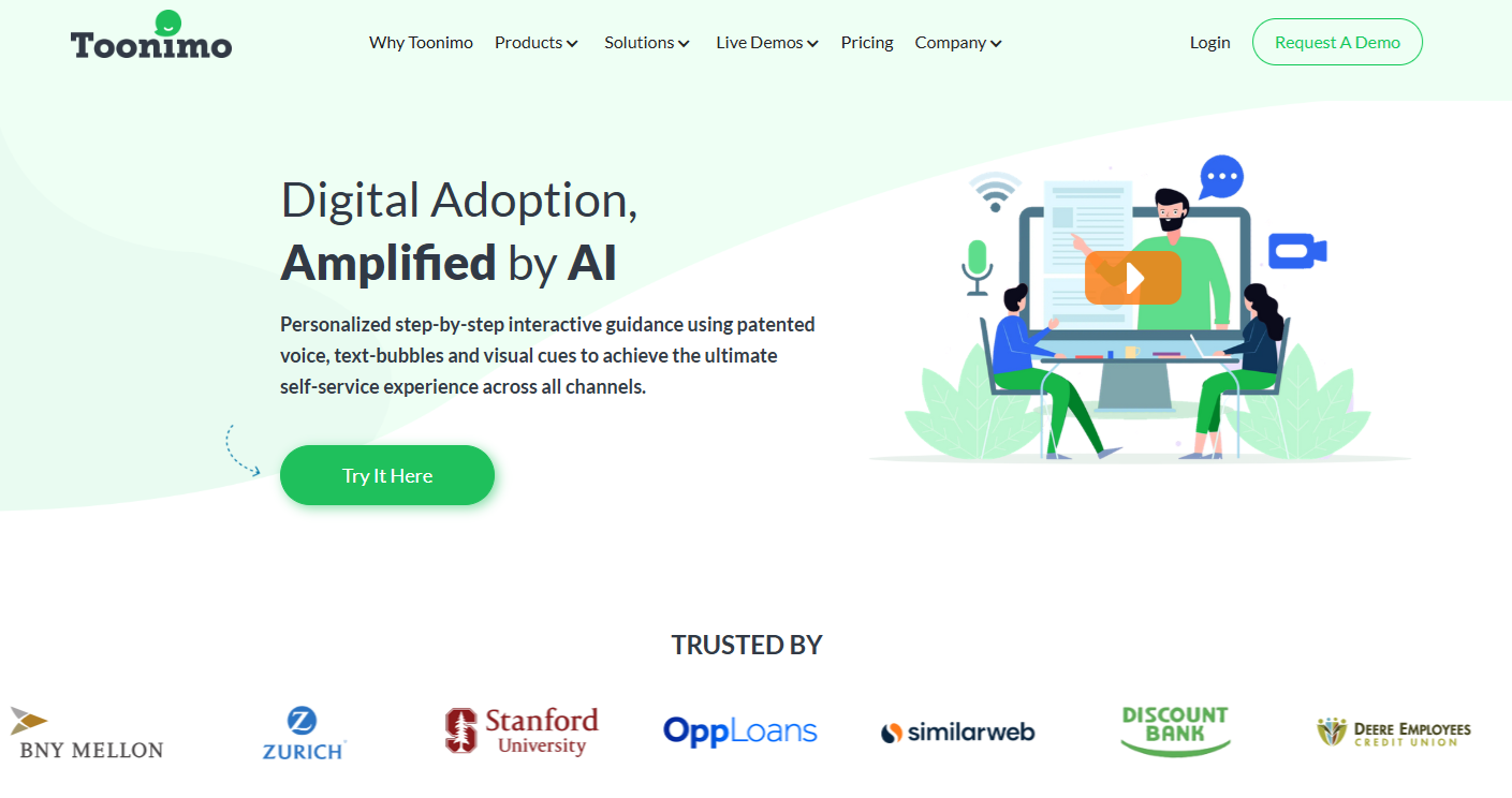 Yes. Toonimo uses patented audio-visual technology with real human voice guidance, text bubbles, and animated coachmarks. It's unique among digital adoption platforms for offering voice walkthroughs across web, mobile native apps, desktop applications, and even IVR systems. This makes it particularly strong for accessibility and multi-channel support experiences.
