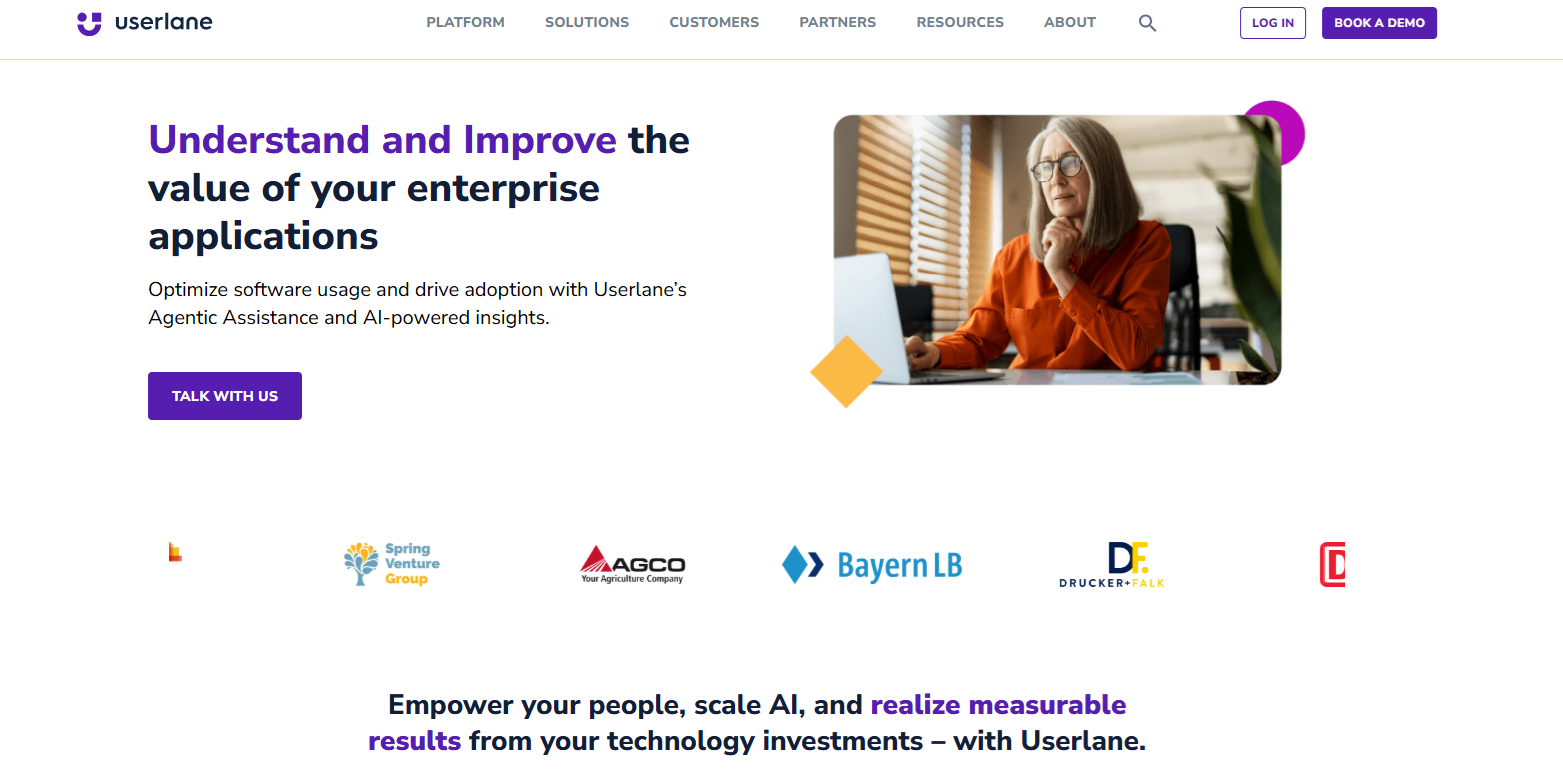 Userlane is an enterprise digital adoption platform that competes with Apty on AI-powered guidance and analytics, but adds a strong compliance angle. While Apty focuses on cross-app workflows and SOP enforcement, Userlane differentiates with Shadow IT discovery to identify unauthorized applications and security risks. With Microsoft collaboration on Agentic Assistance, it delivers proactive, context-aware help across enterprise software. Built for regulated industries and security-conscious teams, Userlane combines adoption metrics with governance controls to ensure compliance while driving measurable ROI.